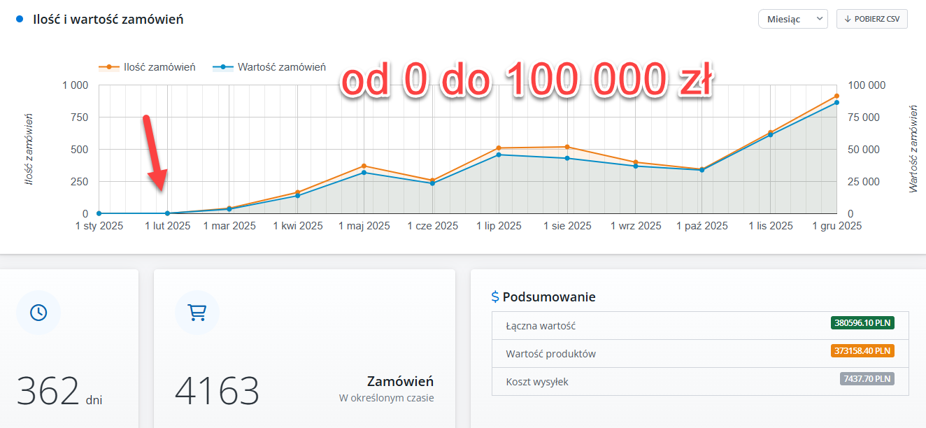 Poniżej wyniki sklepów – przykład sklepu uruchomionego w styczniu 2025 oraz przykład sklepu, z którym pracuję 3 lata.