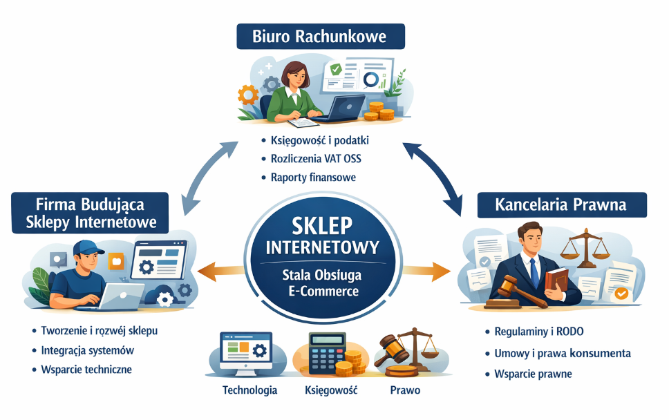 Poniżej przedstawiam czytelny schemat synergii współpracy pomiędzy firmą budującą sklepy internetowe, biurem rachunkowym oraz kancelarią prawną, wraz z krótkim opisem ról i przepływu wartości. Schemat możesz wykorzystać na stronie WWW, w ofercie handlowej lub prezentacji.